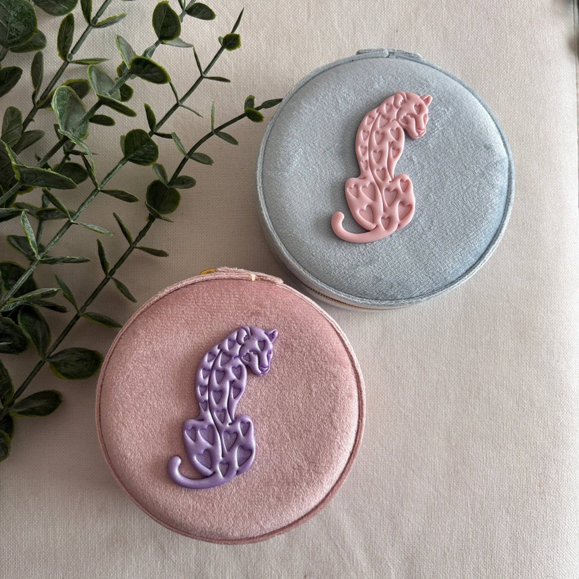 Rundes Schmucketui aus weichem Samt in zarten Frühlingsfarben.